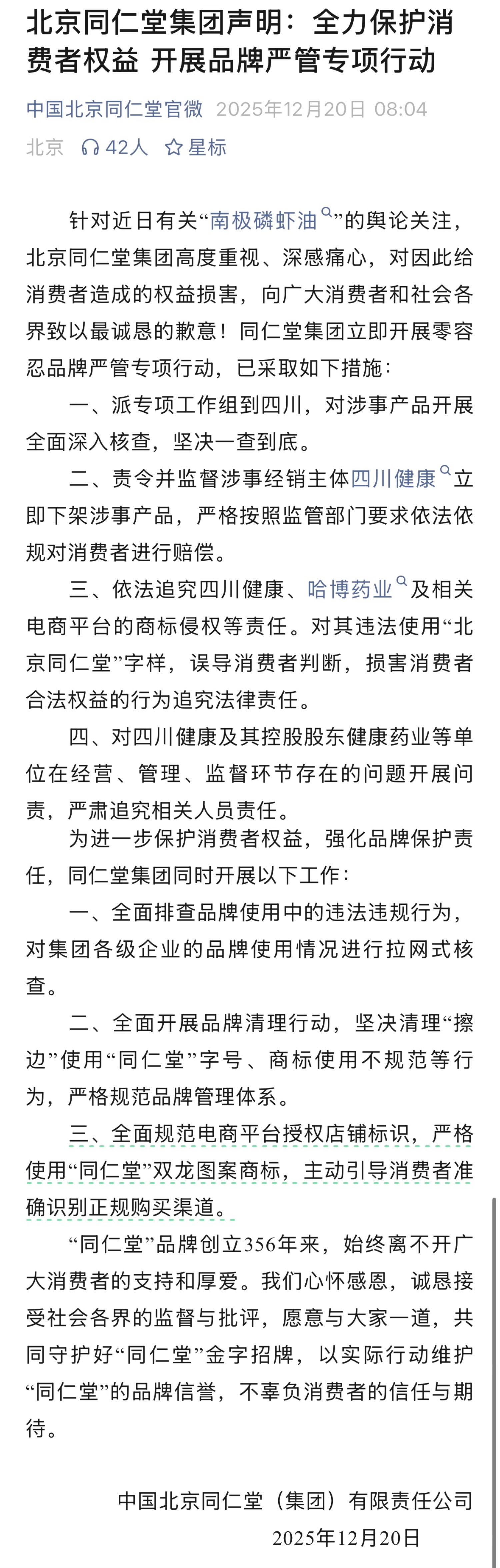 12月20日,中国北京同仁堂(集团)有限职守公司发布声明