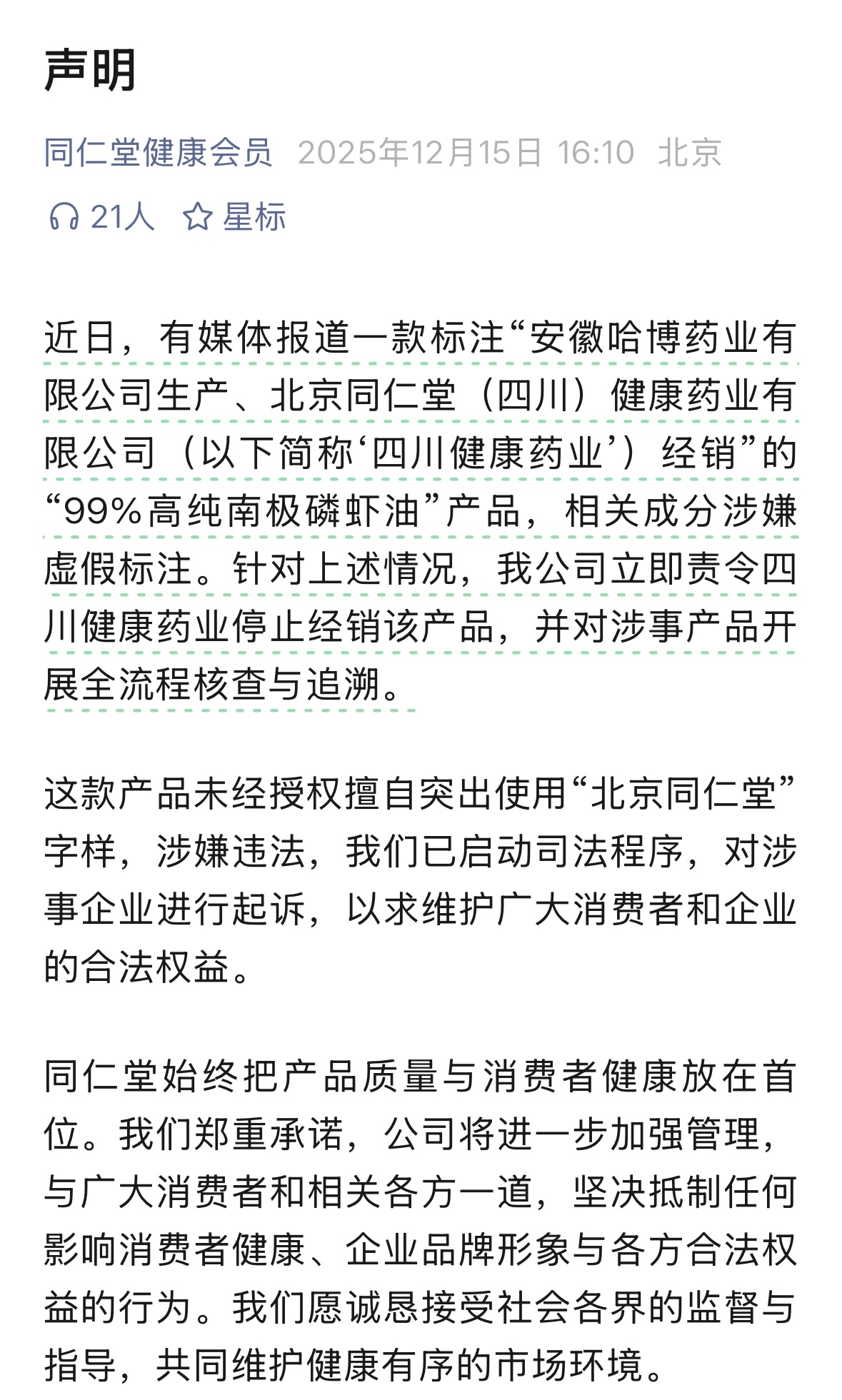 15日下昼,北京同仁堂健康药业股份有限公司的微信公众号发布声明